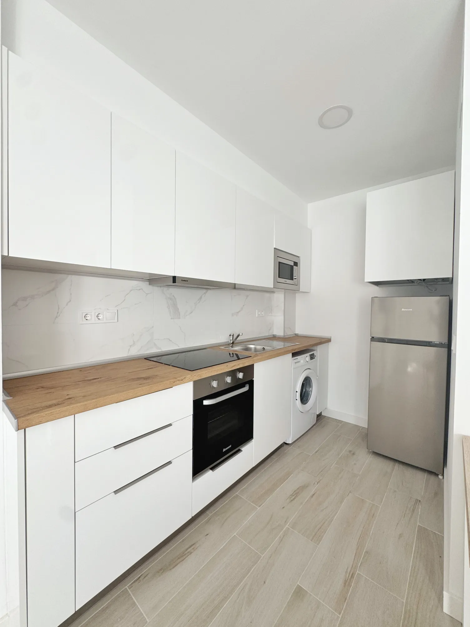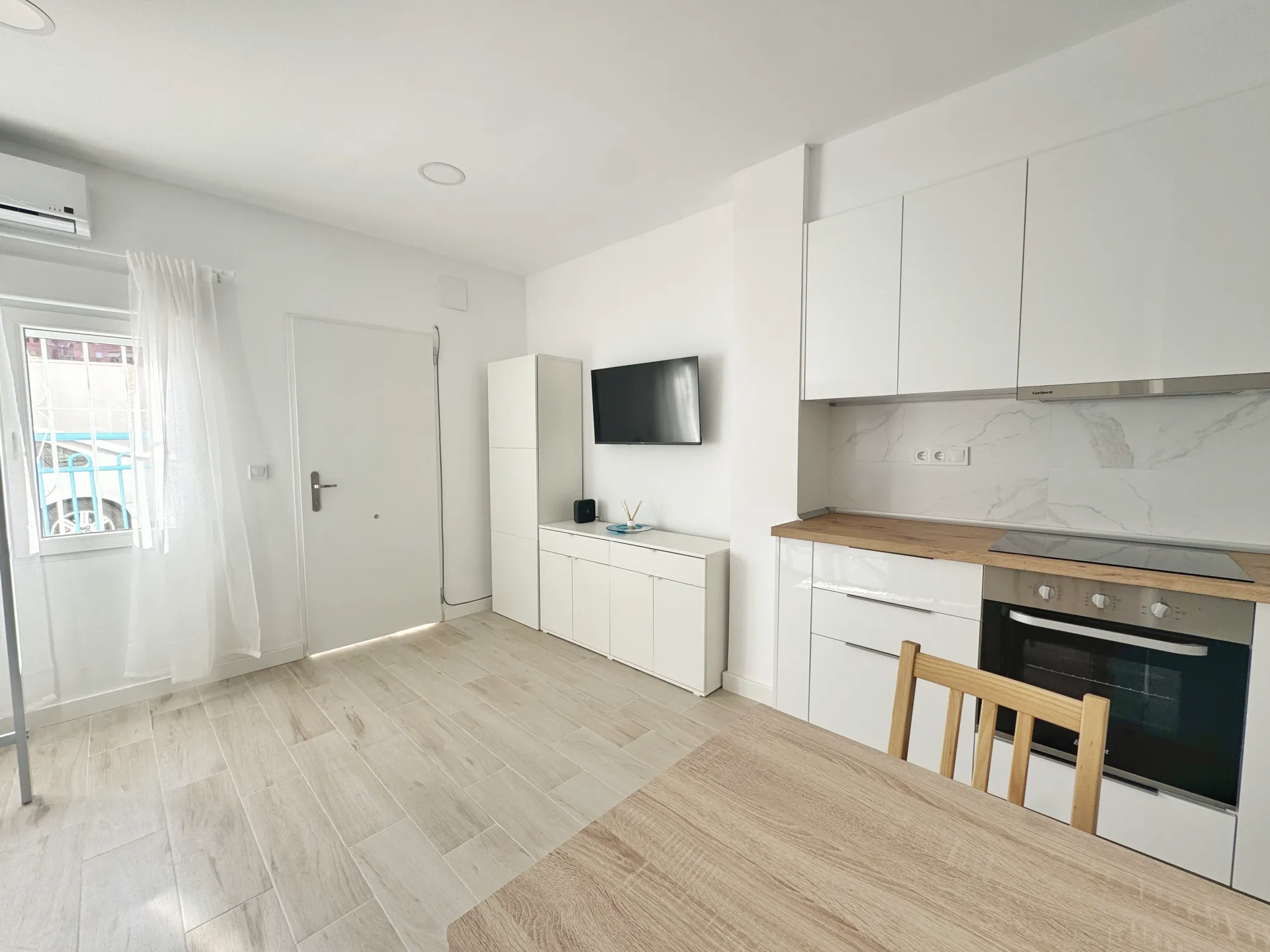 Dispone de una cocina integrada totalmente equipada, con horno, vitrocerámica de cuatro fuegos y amplio espacio de almacenamiento.